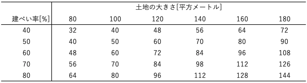 建ぺい率と土地の大きさの関係を表にしてみました.