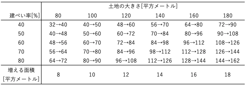 建ぺい率が10%増えるとどうなるのでしょうか.先ほどを同じような表を作ってみました.